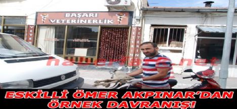 Motosikleti ile yolda giderken bir arabanın köpeğe çarptığını gören Ömer Akpınar arabanın çarptığı köpeği motosikleti ile Eskil ilçe merkezinde bulunan Başarı Veterinerliğe getirdi.