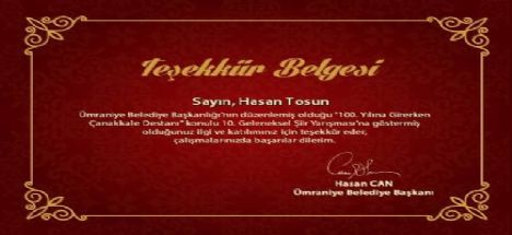 Ümraniye Belediye Başkanlığının Her yıl geleneksel olarak düzenlemiş olduğu “100. Yılına Girerken Çanakkale Destanı” konulu 10. Geleneksel Şiir Yarışmasına katılan yarışmasına katılan Eskilli Şair Hasan Tosun’a Ümraniye Belediye Başkanlığı Tarafından Teşekkür Belgesi verildi.